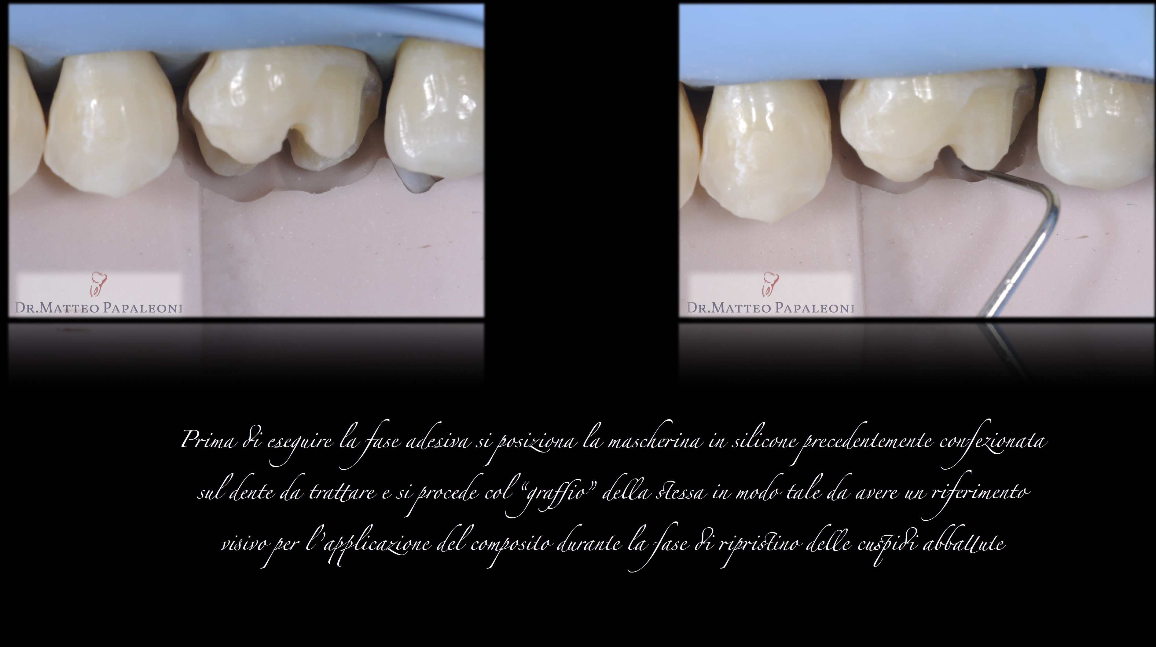 Caso Clinico Dr Matteo Papaleoni (19) Prima di eseguire la fase adesiva si posiziona la mascherina in silicone precedentemente confezionata sul dente da trattare e si procede col “graffio” della stessa in modo tale da avere un riferimento visivo per l ’applicazione del composito durante la fase di ripristino delle cuspidi abbattute.