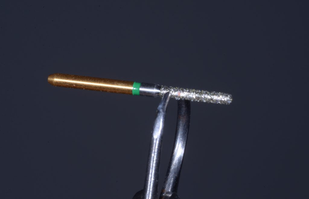 Non prevedendo ulteriori cambiamenti di forma si sceglie una preparazione a spessore lungo tutta la superficie del dente in modo da garantire spazi uniformi al ceramista che dovrà coprire le macchie sottostanti ridando brillantezza ai denti. A tal fine si sceglie una fresa cilindrica a testa arrotondata (6881) da 1 mm (Fig. 5-6) utilizzata per metà (0,5 mm) in modo da limitare la profondità della preparazione che altrimenti esalterebbe la gradazione grigio-marrone del moncone sottostante.