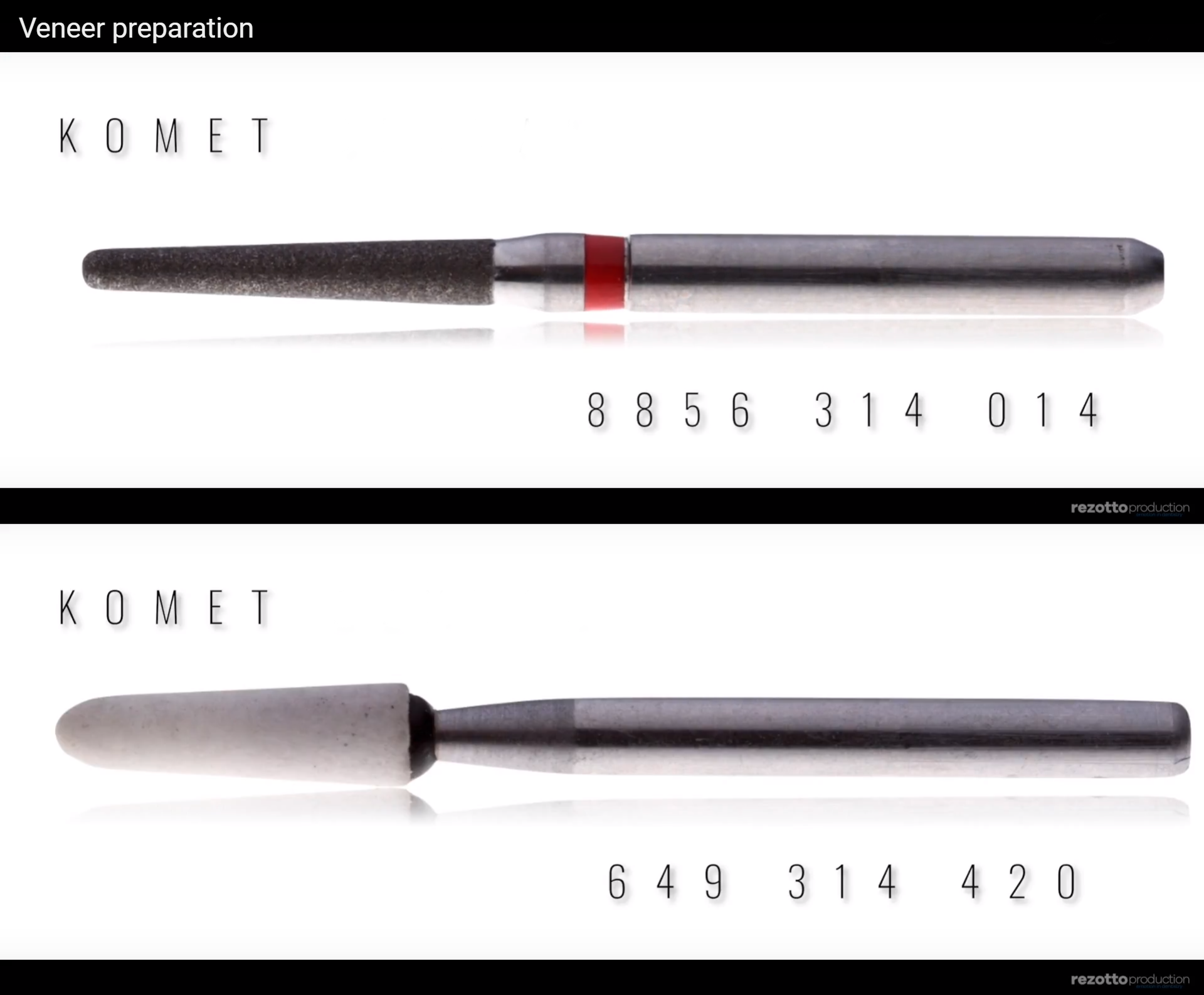 La realizzazione delle faccette è stata fatta preparando i denti con i seguenti strumenti (tutti Komet tranne i dischetti della 3M per la lucidatura):